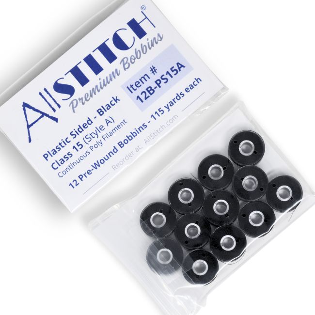 12 Bobbins - AllStitch Plastic Sided Machine Embroidery Bobbins Style A/Class 15 - Black