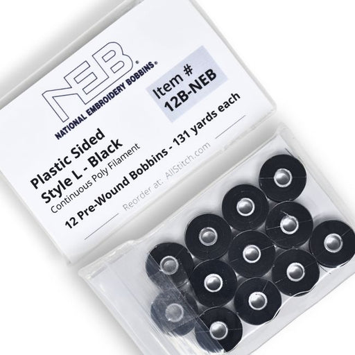 View full detailsNEB (National Embroidery Bobbins) Clear Plastic Sided Embroidery BobbinsSize L Black 60wt 100% Polyester‚ 144 Bobbins- 131 Yds/Bobbin NEB Bobbin em...