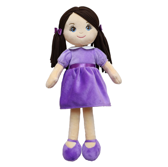 Introducing Fiona, a delightful 16" soft doll from The Summerside Doll Collection, perfect for anyone who loves cuddly companions! With her dark brown hair, in playful pigtails, embroidered sparkling blue eyes, and cute little nose, Fiona’s charm is undeniable. Dressed in a beautiful purple dress with matching shoes and bows, she’s as stylish as she is sweet. Plus, her dress can be removed for personalization — it can be embroidered or imprinted on, offering endless creative possibilities. Whether for play, display, or as a thoughtful gift, Fiona is sure to bring joy and warmth to anyone’s heart!
